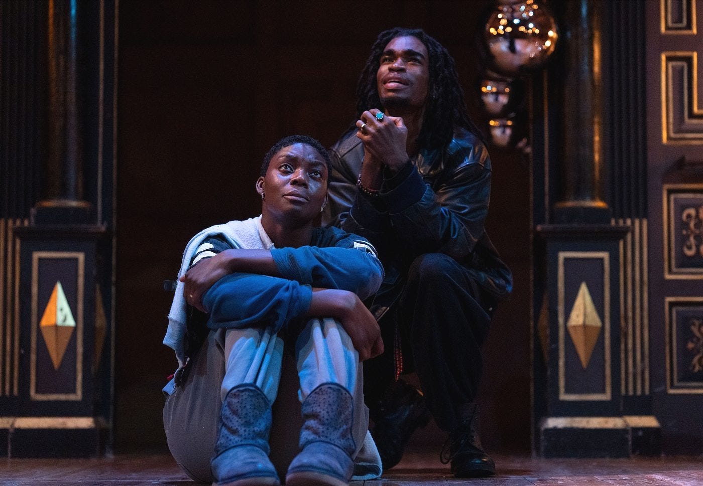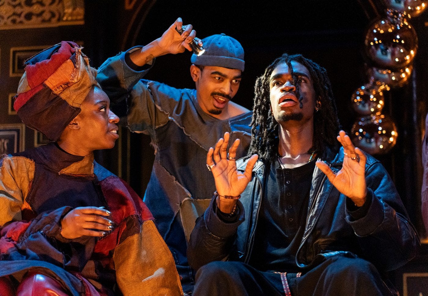 In the Church of Metamorphosis, as the transformed Sam Wanamaker Playhouse has now become, those ancestors are all around Deep, Azure and the rest of us. There are murals of Biggie, Tupac, Aaliyah, Ma Rainey, Sylvester, Prince Carmen Jones Jr, Deep anointed as a Luna goddess… Revolving silver spheres refract the candlelight, further distorting her and our sense of reality.