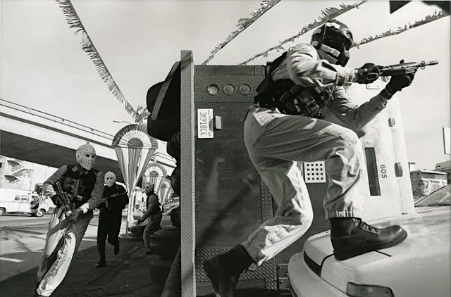 The director took more than 20 years to hone the story, TV pilot LA Takedown serving as a proof of concept along the way. He consulted experts such as Chuck Adamson (the real-life Lt Vincent Hanna) and one-time criminal Eddie Bunker, whose book No Beast So Fierce was required reading for the cast. Mann rode along with LAPD homicide and other officers at night and would make file after file of detailed notes on locations, backstories, edits etc